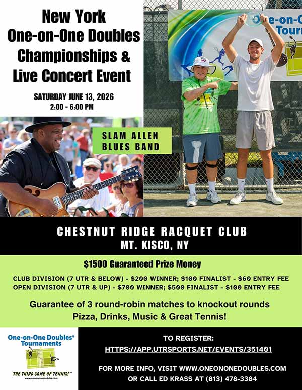 The $1500 NEW YORK ONE-ON-ONE DOUBLES CHAMPIONSHIPS will take place at the Chestnut Ridge Racquet Club, in Mount Kisko, N.Y., on Saturday June 13th.